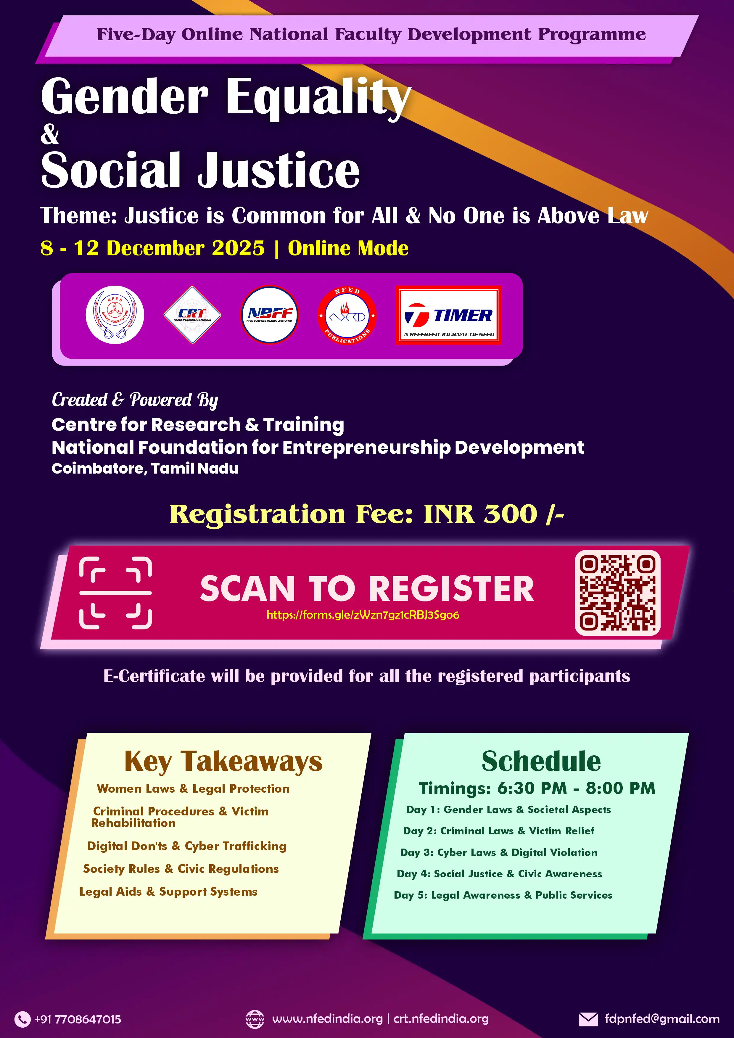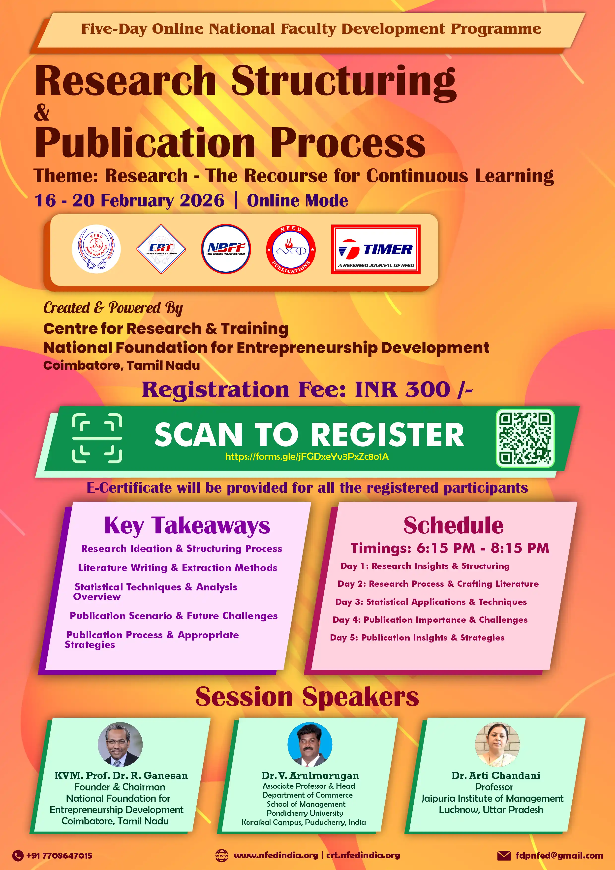 Centre for Research & Training (CRT) is a growth action unit under National Foundation for Entrepreuership Development (NFED) initiated on 7th November 2015 with a goal to bring in quality research and promulgate enterprising faculties within the globe. CRT aims to bring in research and development climate through addressing mainstream aspects of research such as research structuring, research insights, publication process and publication strategies, thereby creating and nurturing research acumen within the aspirants across academia and industry. In addition to this, it also frequently engages in conducting Faculty Development Programmes (FDPs), Research Orientation Programmes (ROPs), Quality Publications (QPs) through infusing the importance of research and development. CRT has conducted more than 100 sessions and webinars for understanding new vistas in research and facilitating research career of academicians, scholars, practitioners, etc.